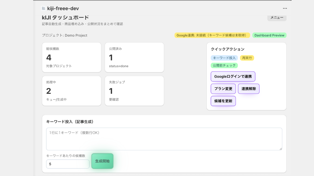 書きたいテーマのキーワードを入力するだけで、構成から本文までSEOを意識した高品質な記事をAIが瞬時に生成します。
